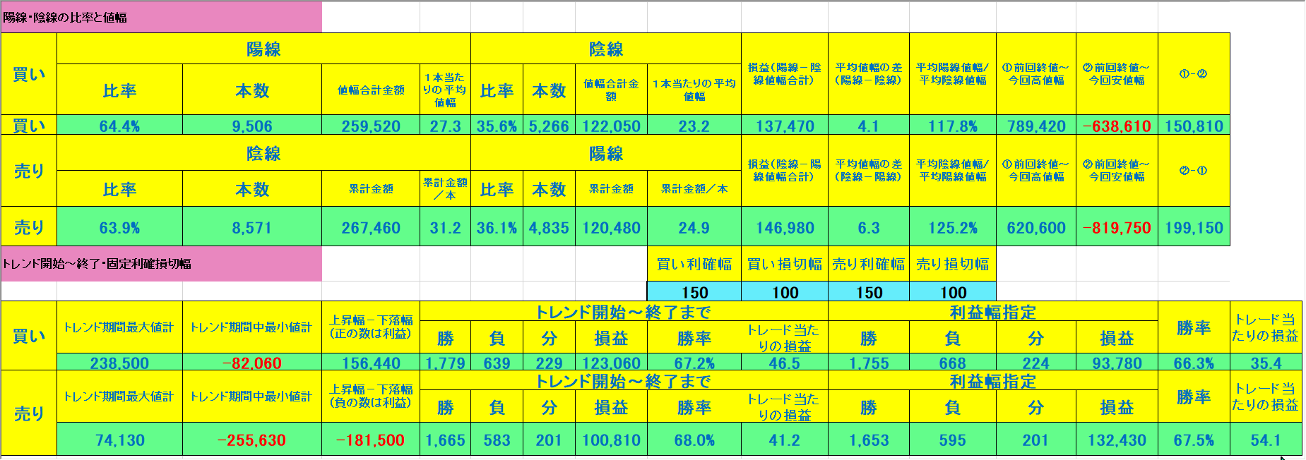 緑色や青色のマーカーは買いシグナル、赤色や黄色のマーカーは売りシグナルです。